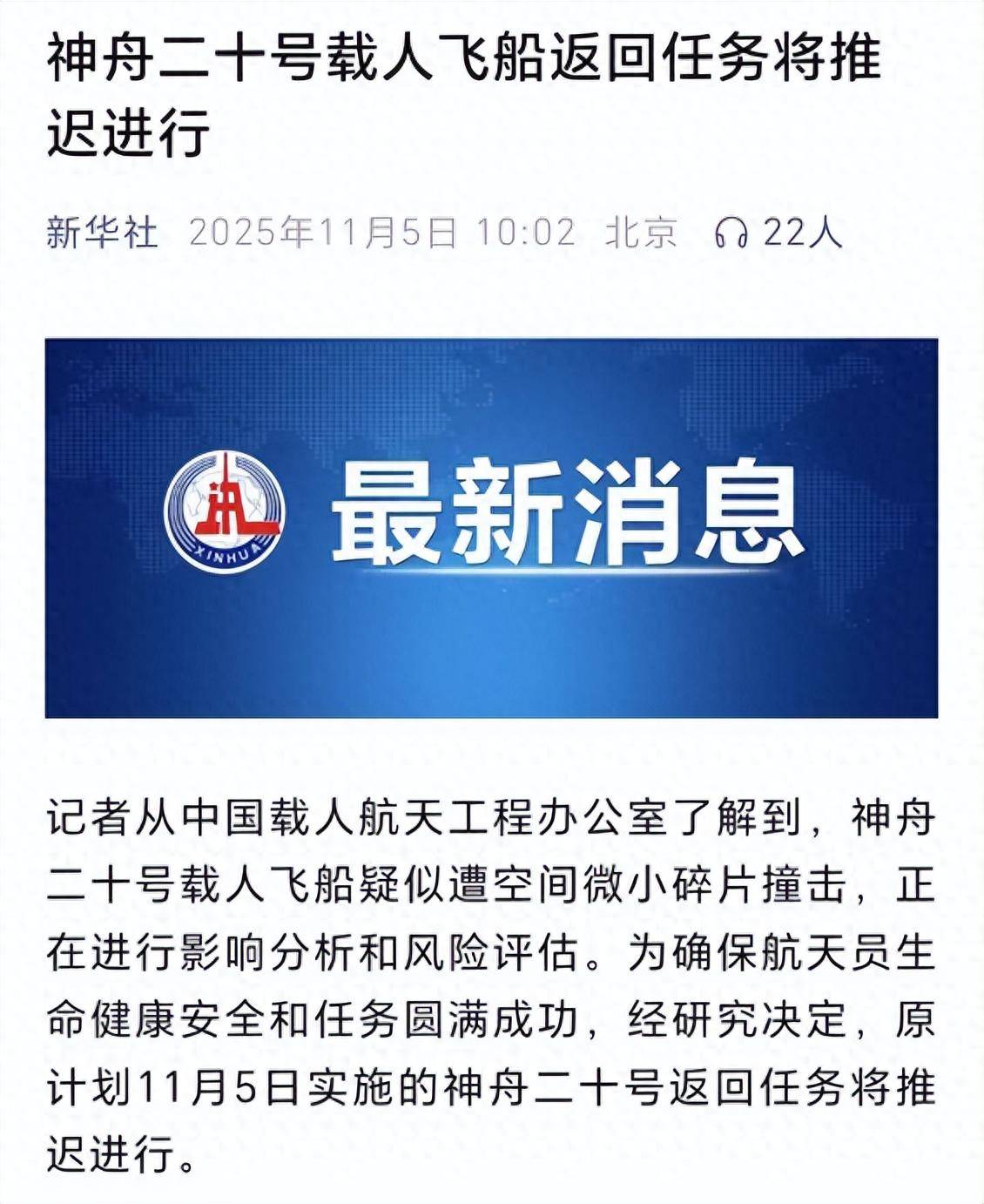 这件事发生得非常突然。神舟二十号于今年4月24日发射,指令长陈冬是经验丰富的老航天员,而另外两位则是首次进入太空的新人。按计划,航天员们本应于11月5日返回地球。整个返航过程已经做过多次系统演练,家属也已准备好迎接他们的归来。但就在最后一刻,飞船的监测系统发现了异常。工程团队需要时间弄清楚飞船受损的具体情况,评估损伤的程度,以及是否会影响返回时飞船的气密性和热防护系统。