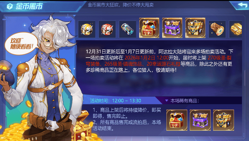 听闻阿达拉讯息,黑市商人运上新一批珍稀物品速速赶来,盛大的金币拍卖会即将展开~