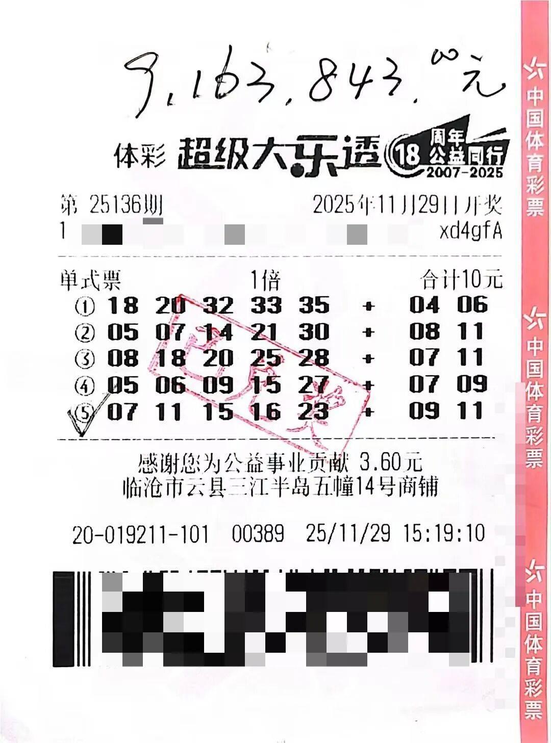“我买彩票很随意,不是每期都买,想起来才买。”李先生表示自己买彩票时一直保持着理性克制的态度,“每次就花10块钱,买一张5注单式票,这个号码是机选的,连续买了一年左右。”