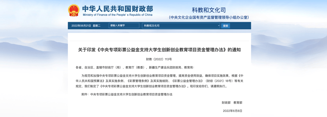 2025年6月,财政部发布《关于下达2025年中央专项彩票公益金支持大学生创新创业教育项目预算的通知》,下达中央专项彩票公益金3000万元,专项用于支持大学生创新创业教育发展,支持各地依托省内高校建设国家级创新创业学院、国家级创新创业教育实践基地。