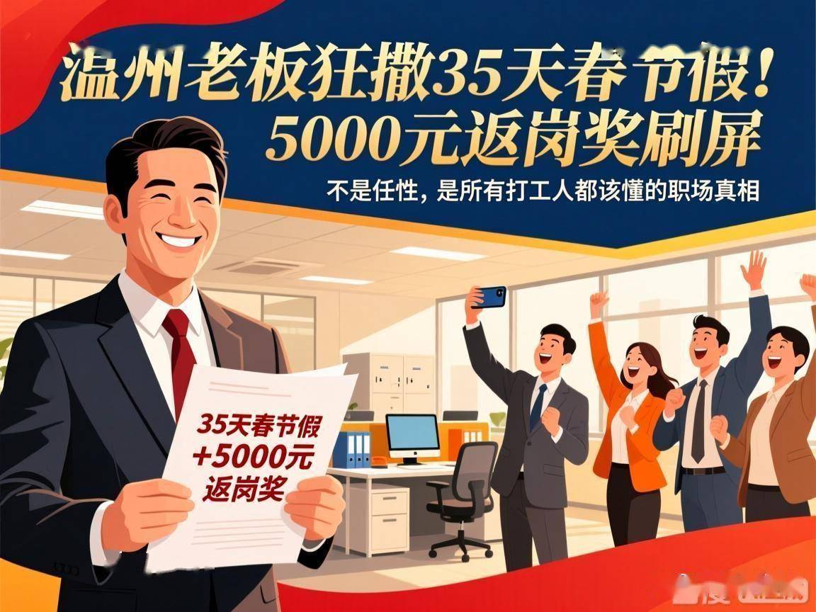 这家公司在温州,做五金生意,老板姓张,办厂已经十多年了。1月10日,公司贴出春节放假通知,核心内容就三条:2月1日正式放假,3月8日复工,假期35天;按时离岗、按时返岗,每人5000元奖励,3月底发放;有学龄儿童的员工,送娃开学后2日内返岗,提前登记就能照常拿奖励。另外,老员工介绍新人干满3个月,还能拿1000元介绍费。
