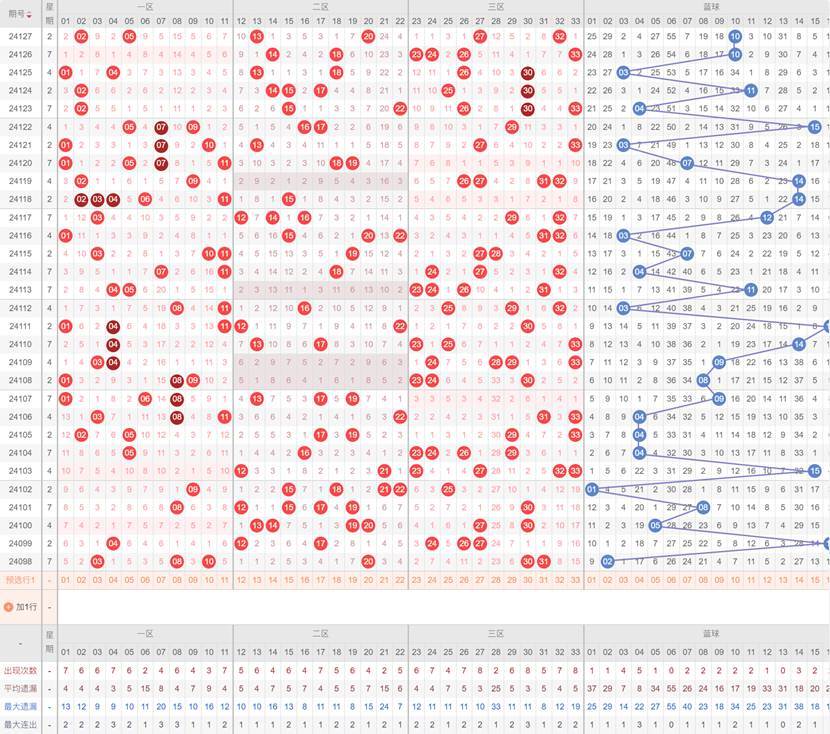 分析区间分布:将红球分为几个区间(如1-11、12-22、23-33),观察各区间出号的均衡性,选择分布较为均匀的号码组合。